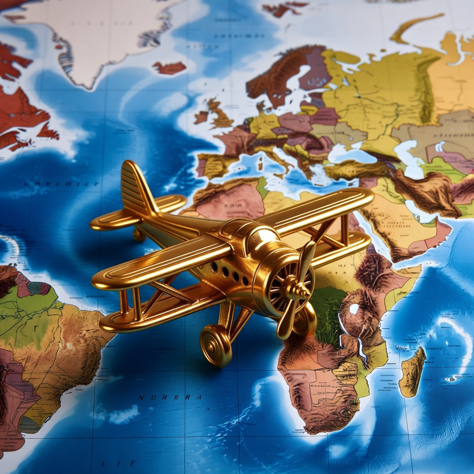 A small golden toy biplane with propellers sits on a colorful world map. The airplane is positioned over Africa and the Atlantic Ocean, with detailed continents like Europe, South America, and Asia visible. The map has a textured, glossy surface highlighting global travel themes.