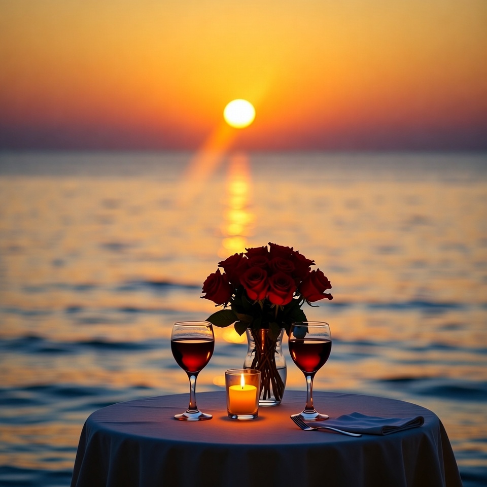 A small round table is set on the beach with two glasses of red wine, a bouquet of red roses, and a lit candle. The table is covered with a white cloth and positioned in front of the ocean during a vibrant sunset. The sun's golden rays reflect on the calm sea water.