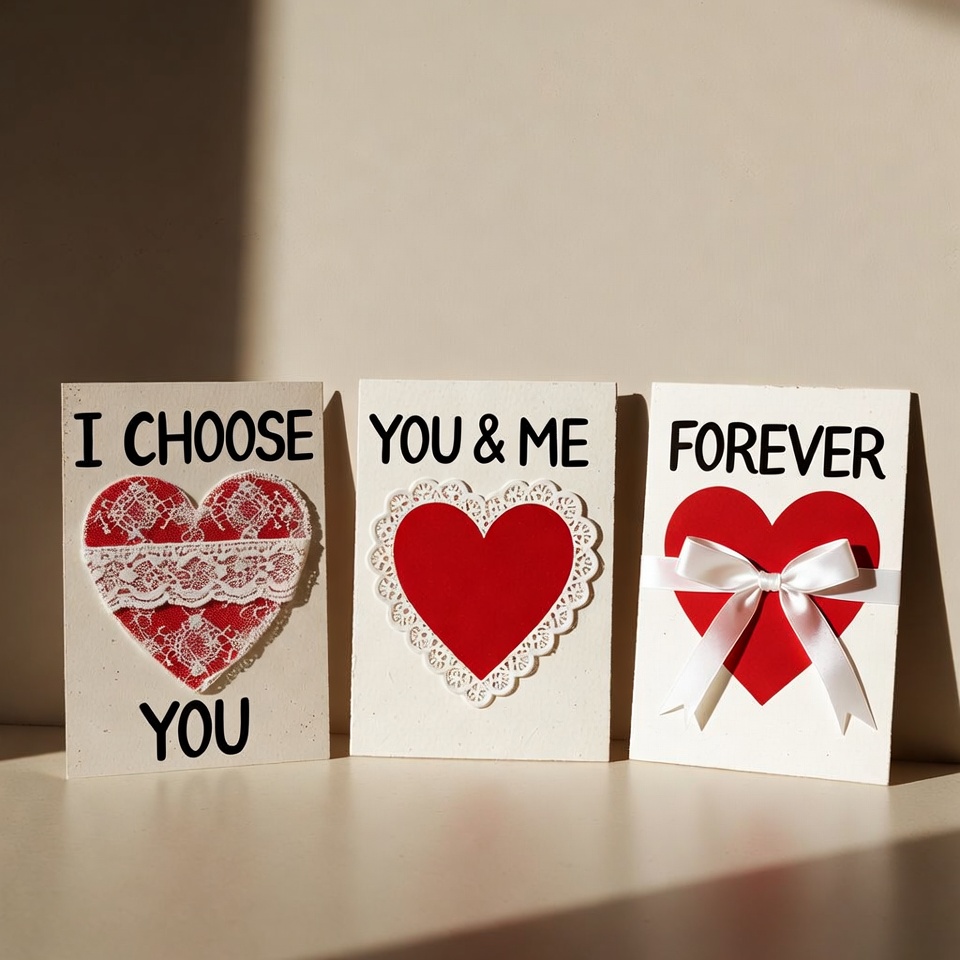 Three white handmade cards feature romantic messages with red lace-trimmed hearts. The left card reads 'I choose you' with a red heart applique and lace. The center card says 'You & Me' topped with a white lace heart, and the right one displays 'Forever' with a red heart and white bow, arranged on a light surface with soft shadows.