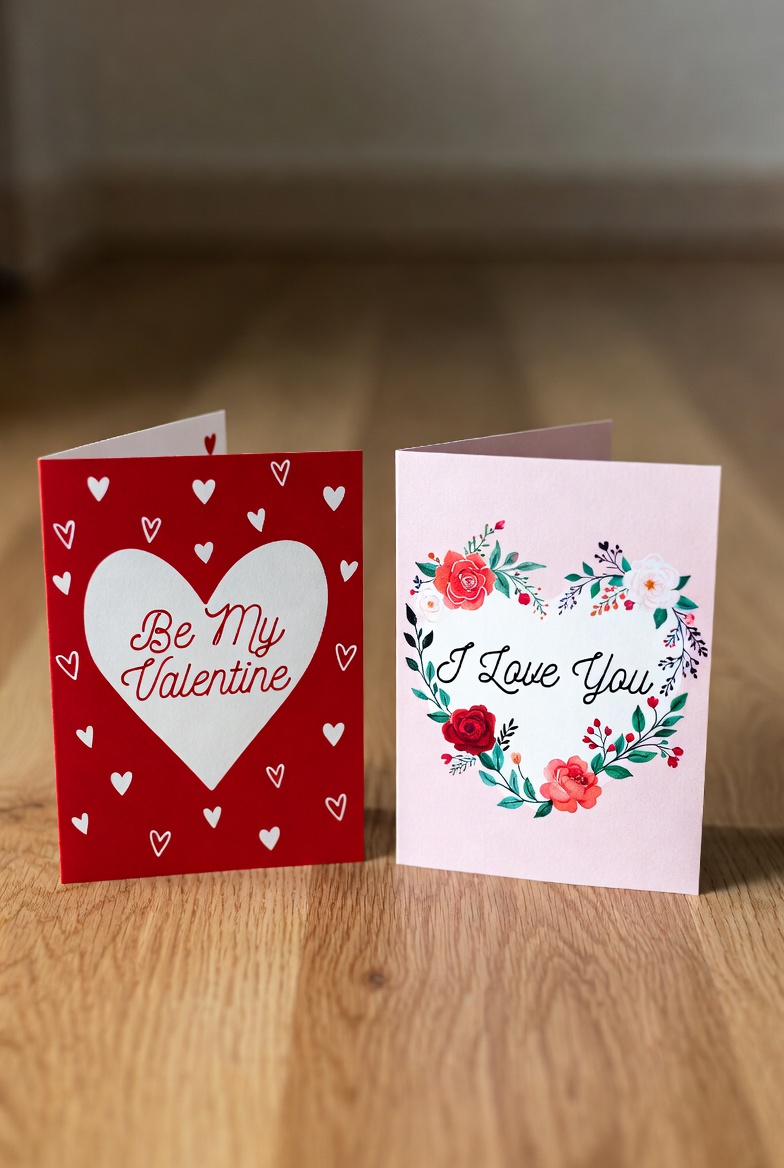 Two Valentine's Day greeting cards are displayed on a wooden surface. The red card features white heart patterns and 'Be My Valentine' text inside a large heart. The pink card has a floral wreath of red roses and greenery with 'I Love You' inscribed in the center.