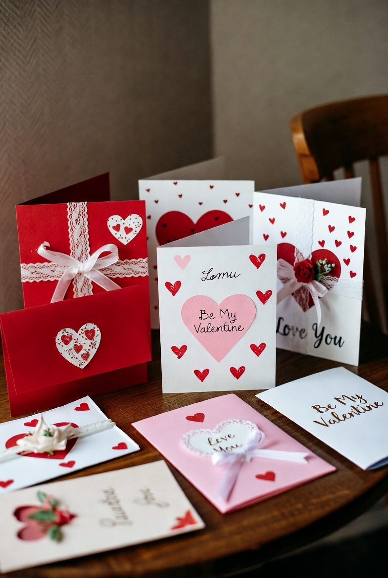 A collection of red and pink Valentine's Day greeting cards is arranged on a wooden table. The cards feature heart designs, lace, ribbons, bows, and messages like 'Be Mine', 'Love You', and 'Valentine'. They are displayed against a cozy indoor background with a wooden chair nearby.