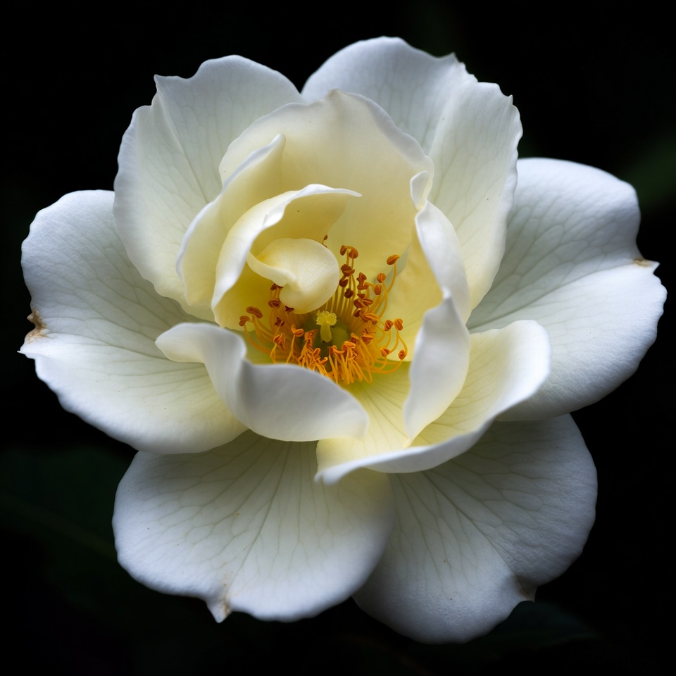 bloom, close-up, cream petals, floral, flower, flower macro, garden flower, isolated background, macro photography, nature, orange center, petals, rose flower, stamen, white petals, white rose