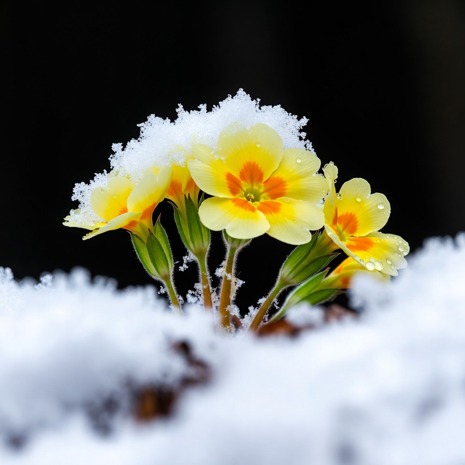A cluster of yellow primrose flowers blooms amidst fresh white snow. Delicate snowflakes cover the petals and stems, contrasting against the dark background. The vibrant flowers stand resiliently in the winter setting.