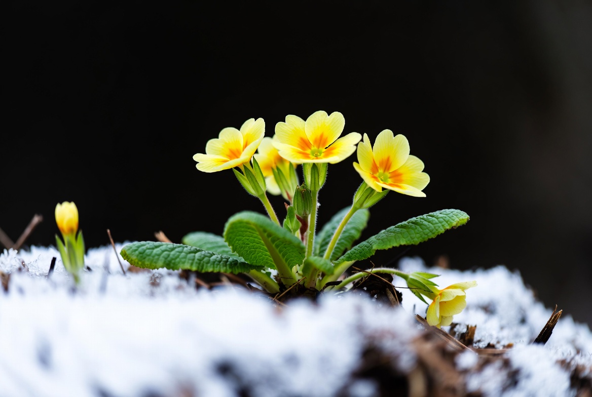 blooming plant, cold weather, dark background, floral, flower cluster, green leaves, macro photography, nature, orange centers, outdoors, primrose plant, snow, white snow, winter flowers, yellow flowers, primroses