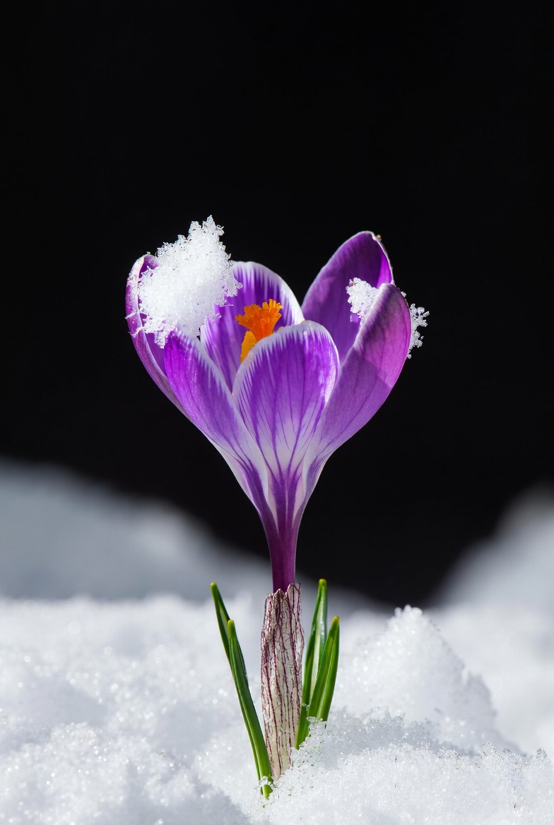 A vibrant purple crocus flower with orange stamens blooms amidst fresh white snow. Delicate snowflakes cling to its petals, contrasting against the dark background. Thin green leaves emerge from the snow at its base.