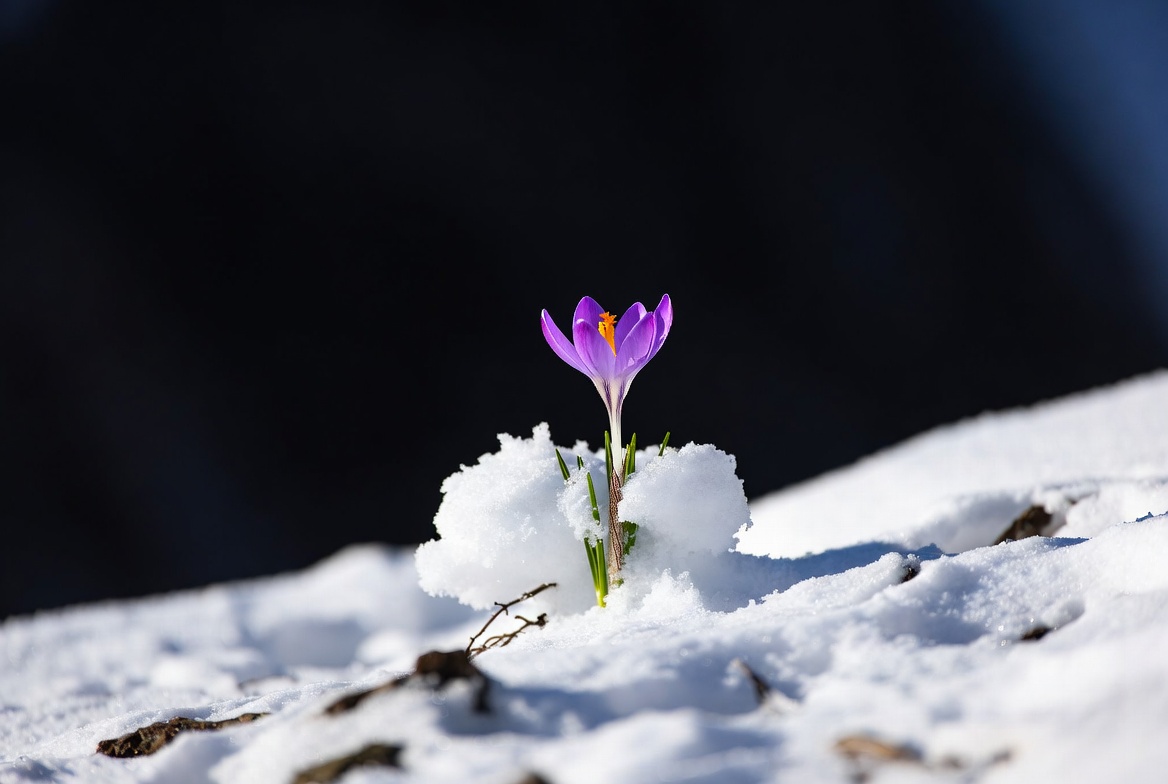 Purple crocus blooming in snow