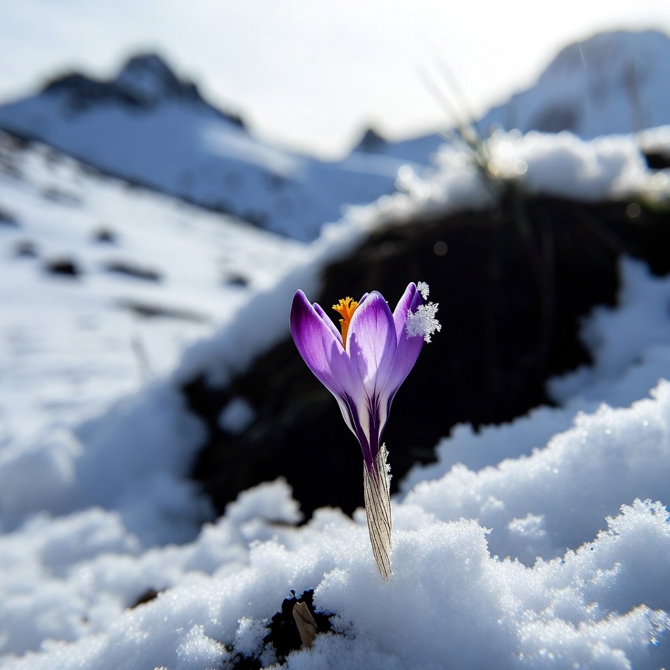 Purple Crocus Blooming in Snowy Mountains