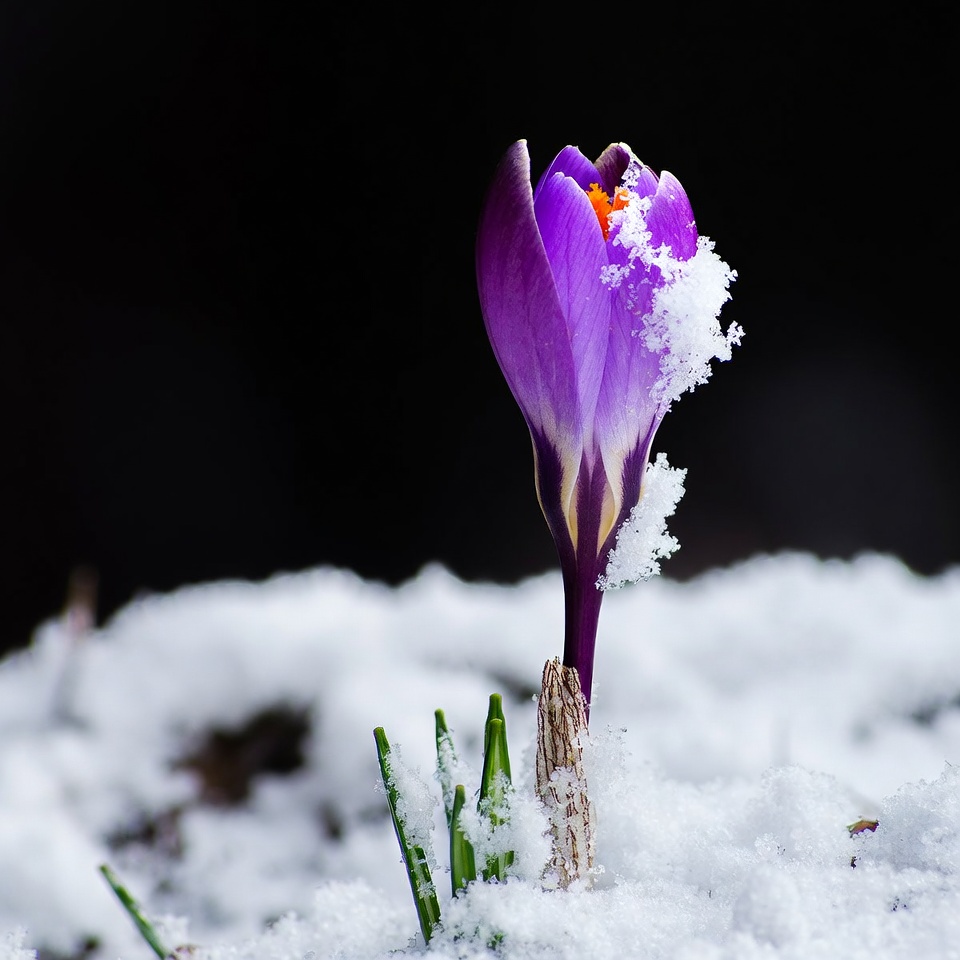 A vibrant purple crocus flower blooms amidst fresh white snow. Its petals are partially covered in snow, with a bright orange stamen visible in the center. Thin green shoots and a stem emerge from the snowy ground on a dark background.