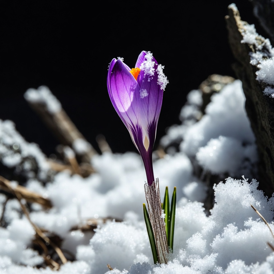 A vibrant purple crocus flower emerges from the snow with delicate white petals covered in frost. The flower features bright orange stamens and thin green leaves at its base. Snow and dark branches surround the isolated bloom against a snowy background.