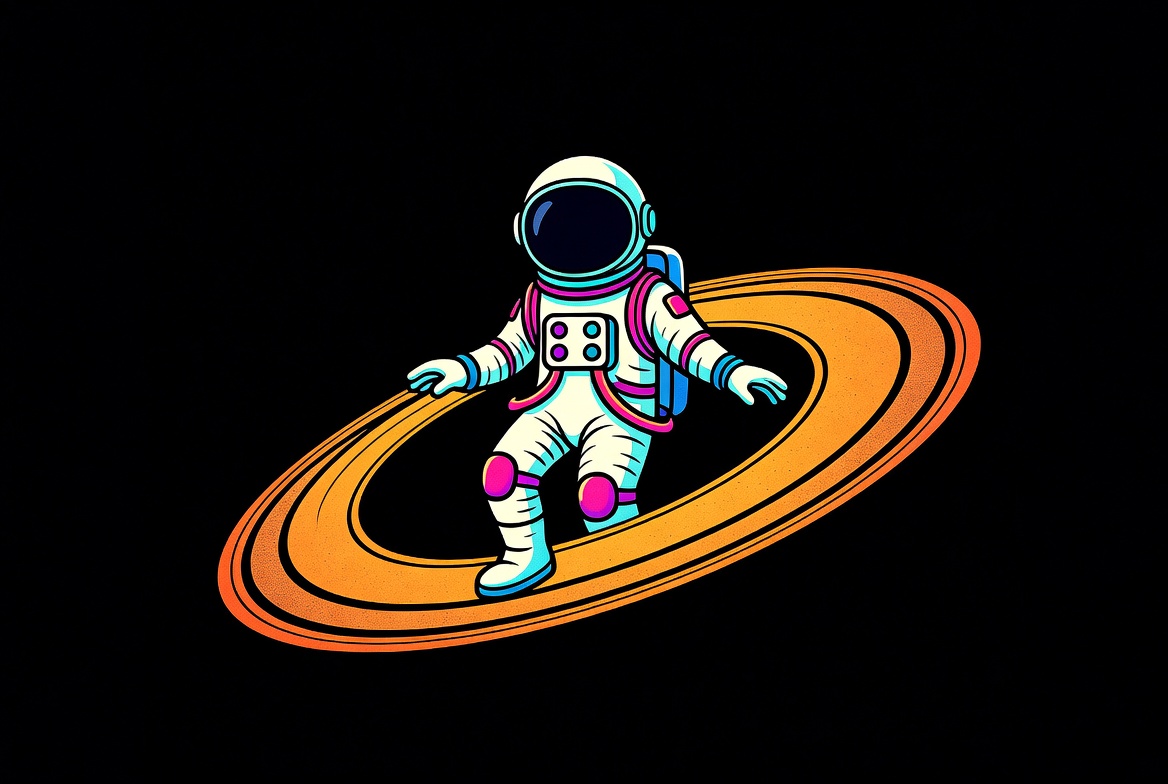 A colorful cartoon astronaut in a white spacesuit with pink and blue accents sits on a large orange ring. The astronaut holds arms outstretched as if balancing or surfing on the glowing ring. The illustration is set against a solid black background.