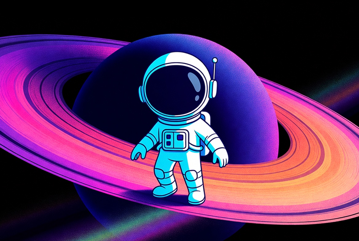 A cartoon astronaut in a white spacesuit with helmet stands on a vibrant purple Saturn planet. The scene features neon pink, purple, and orange rings around the planet against a black space background. The illustration has a glowing, futuristic style with bright highlights.