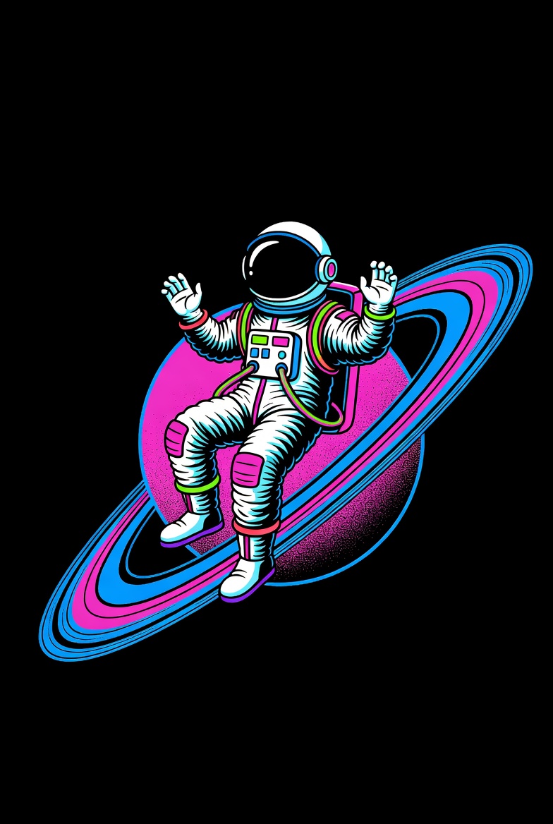 Saturn, black background, clipart, cosmic, excited pose, futuristic, galaxy, illustration, neon colors, outer space, pink, planet, planetary rings, purple, raised arms, rings, sci-fi, sitting, space, spacesuit, vector art, white suit, astronaut