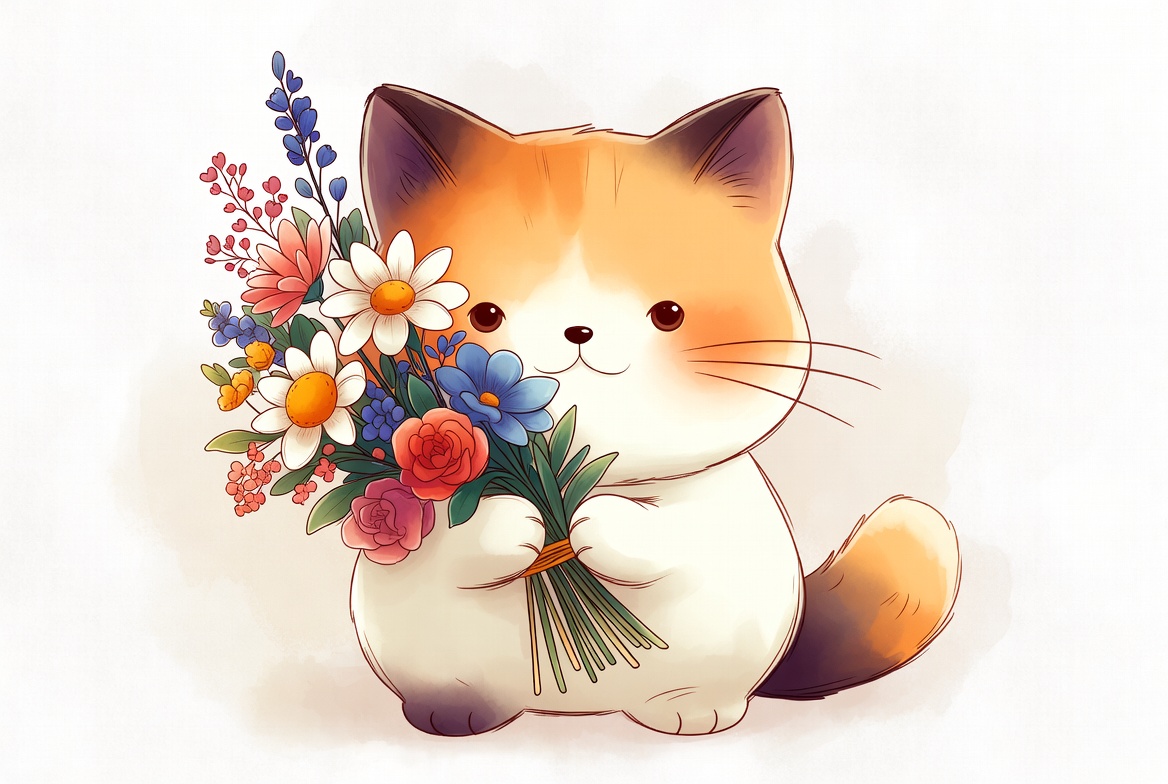 An adorable chibi-style orange tabby cat with white paws holds a vibrant bouquet of flowers including daisies, roses, and lavender. The cat has a happy expression with big sparkling eyes and a smiling mouth. The illustration features a soft watercolor style on a plain white background.
