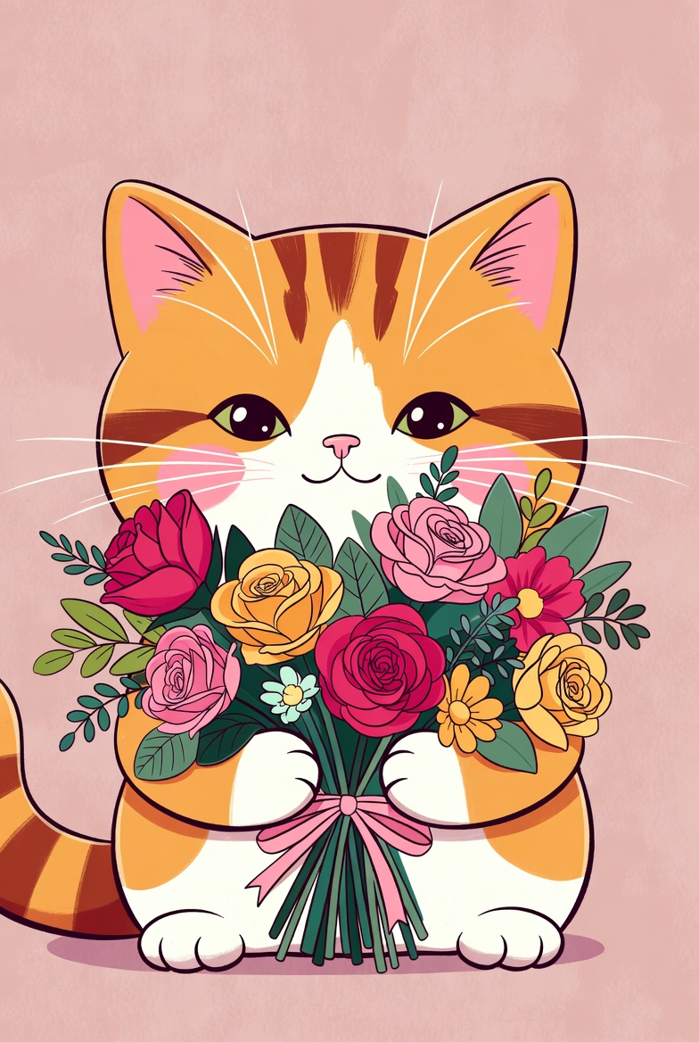 An adorable cartoon orange tabby cat with big green eyes holds a vibrant bouquet of roses and other flowers. The cat has a smiling expression and wears a pink ribbon around the flower stems. The illustration features a soft pink background.