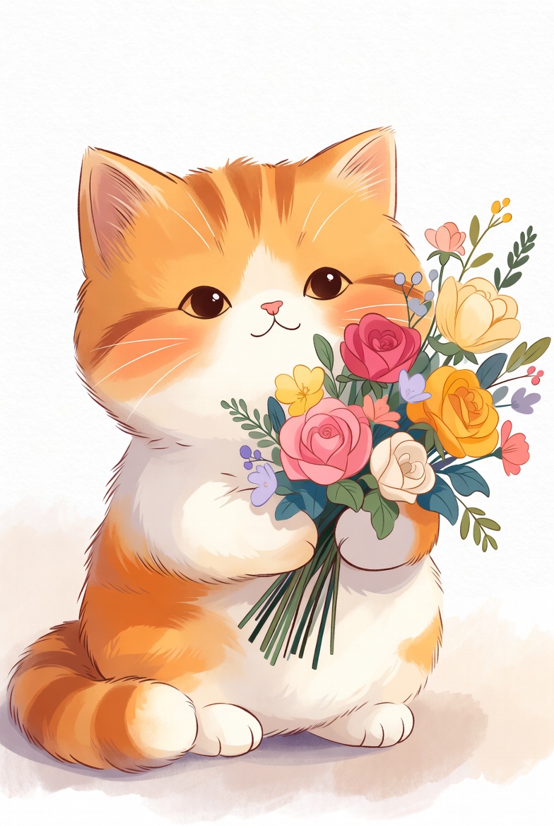 An adorable orange tabby kitten with big expressive eyes holds a vibrant bouquet of colorful flowers including pink, yellow, and white roses. The kitten sits on a plain white background with its white paws gently grasping the flower stems. The illustration features soft, detailed linework and shading for a charming effect.