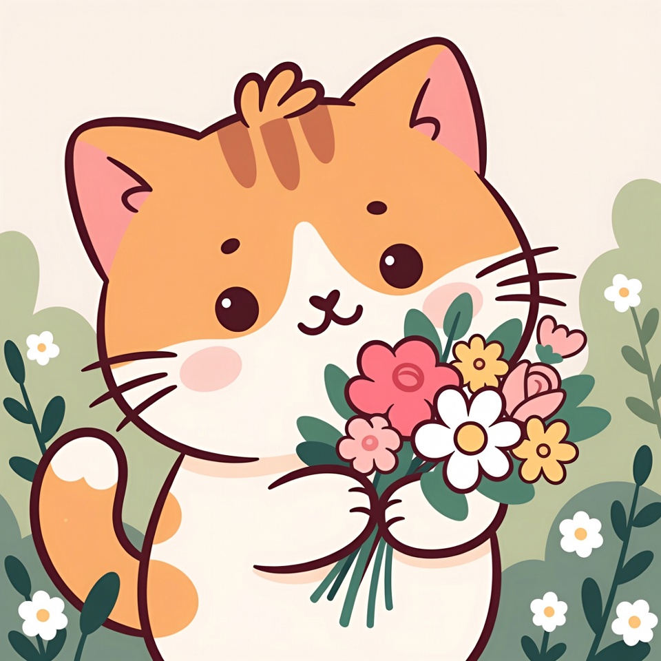 A kawaii illustration of an adorable orange tabby cat with big sparkling eyes holds a vibrant bouquet of pink, white, and yellow flowers. The cat stands on a light green background surrounded by scattered flowers and green leaves. Its fluffy fur and cheerful smile add to the cute cartoon style.