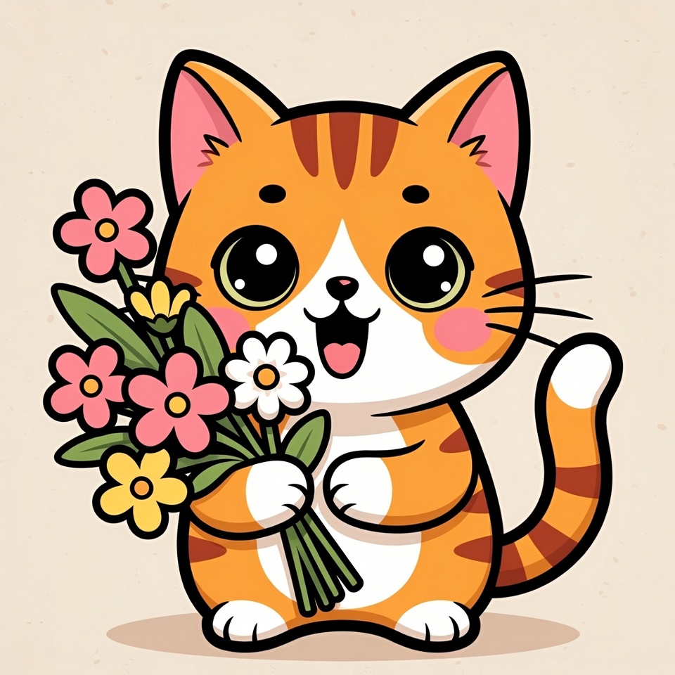 A chibi-style cartoon orange tabby cat with big sparkling eyes and a happy smile holds a vibrant bouquet of pink, yellow, and white flowers. The cat has white paws and chest, striped fur, and stands on a plain background. The illustration features bold outlines and a kawaii aesthetic.