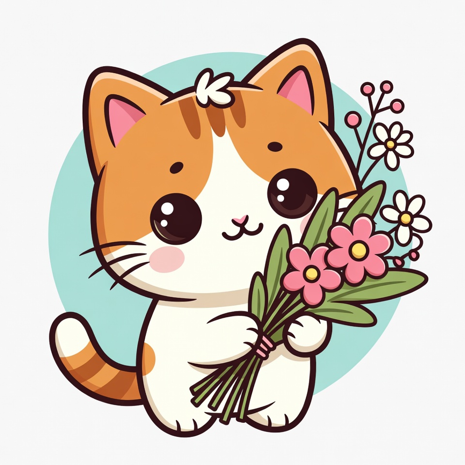 A kawaii cartoon orange tabby cat with white chest and big sparkling eyes holds a bouquet of pink and white flowers. The cat has a joyful expression with a small smile and is posed cutely on a light blue circular background. The illustration features bold outlines and vibrant colors in a chibi style.
