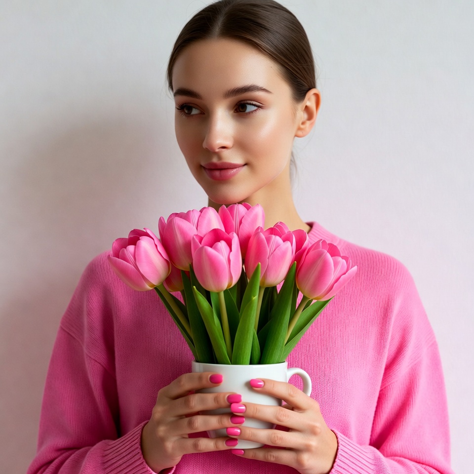 A young woman with brown hair in a ponytail holds a white pot of vibrant pink tulips. She wears a pink sweater and gazes thoughtfully at the flowers against a white background. Her hands with pink nail polish grip the pot gently.