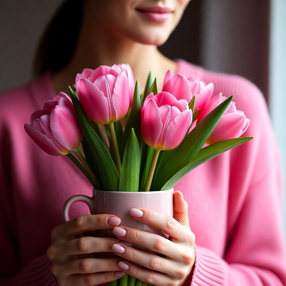 A woman with long dark hair in a ponytail holds a vibrant bouquet of pink tulips in a white mug. She wears a pink sweater and has pink manicured nails. The image features a soft window light background.