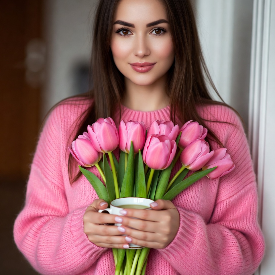 A young woman with long brown hair and subtle makeup holds a bouquet of vibrant pink tulips in a white mug. She wears a cozy pink sweater and stands indoors near a white door with a blurred background. Her expression is gentle and smiling as she gazes at the camera.