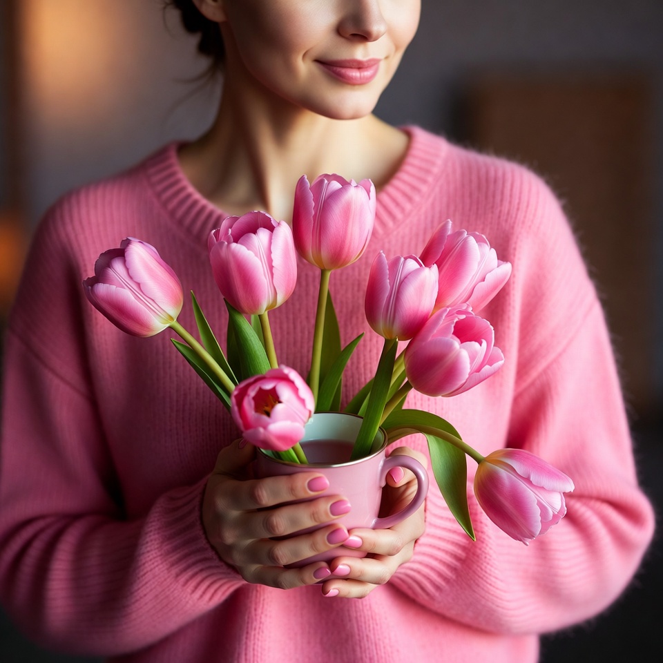 A smiling woman with her hair in a bun holds a cup of vibrant pink tulips close to her chest. She wears a soft pink sweater and has pink nail polish on her hands. The background is softly lit with warm indoor lighting.
