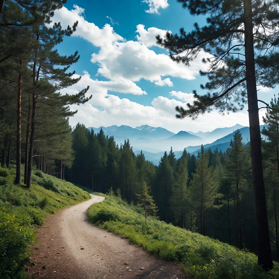 A dirt path winds through a lush pine forest on a grassy hillside under a bright blue sky with scattered white clouds. Snow-capped mountains rise in the distant background, shrouded in mist. Tall pine trees frame the scenic trail leading into the forested valley.