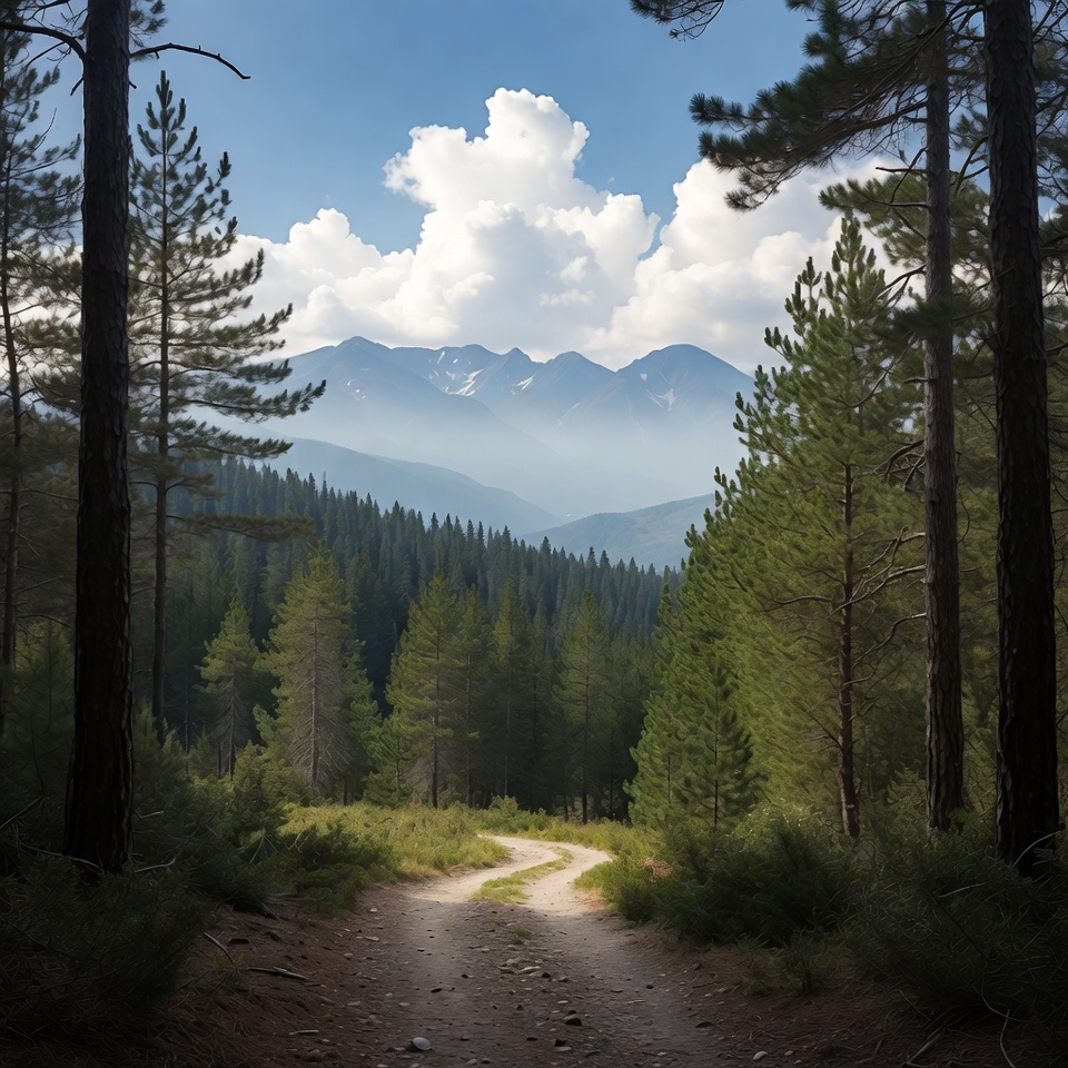 A winding dirt path leads through a lush pine forest under a bright blue sky. Snow-capped mountains rise in the distant background, framed by tall pine trees. Fluffy white clouds partially obscure the mountain peaks.