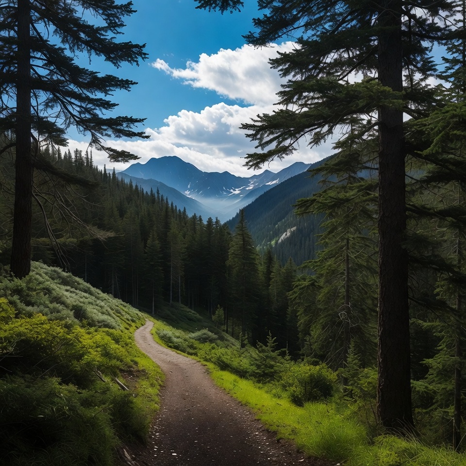 alpine scenery, blue sky, clouds, coniferous forest, dirt path, evergreen trees, fir trees, forest, green grass, hiking trail, landscape, mountain path, mountains, nature, outdoor, peak, pine trees, ridge, scenery, shrubs, sky, snow-capped peaks, valley, wilderness, trail