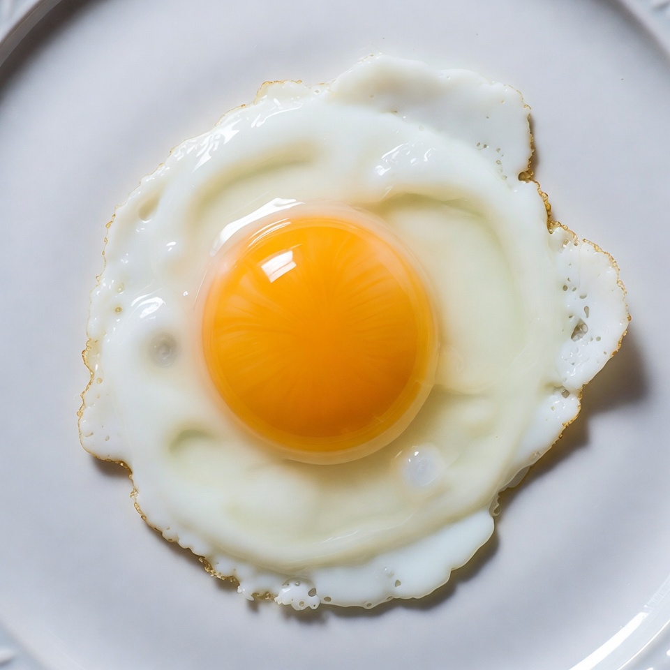 A sunny-side-up fried egg with a bright yellow yolk sits centered on a white plate. The egg white spreads out around the glossy yolk, with slightly crispy edges. The plate has a subtle decorative rim and is viewed from directly above.
