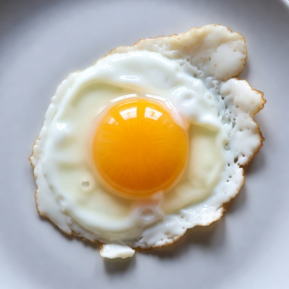 A sunny-side-up fried egg sits on a plain white plate. The egg features a bright yellow yolk surrounded by runny white edges with crispy browned borders. It is centered and viewed from above against a simple background.