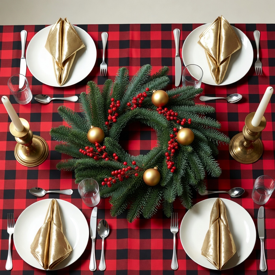 A festive Christmas wreath made of green fir branches, red berries, and gold ornaments sits centered on a red and white checkered tablecloth. The table is elegantly set with white plates, gold napkins, silver utensils, clear glasses, and gold candlesticks holding red candles. The setup features four place settings arranged symmetrically around the wreath.