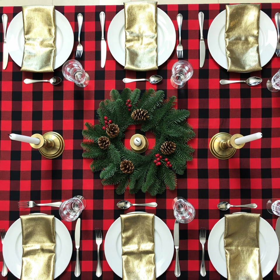 Christmas decor, berries, candlesticks, checkered tablecloth, dining table, evergreen branches, festive setting, forks, gold candle, gold napkins, holiday table, knives, no people, pinecones, red black plaid, silverware, spoons, table setting, white plates, wine glasses, wreath centerpiece, Christmas wreath
