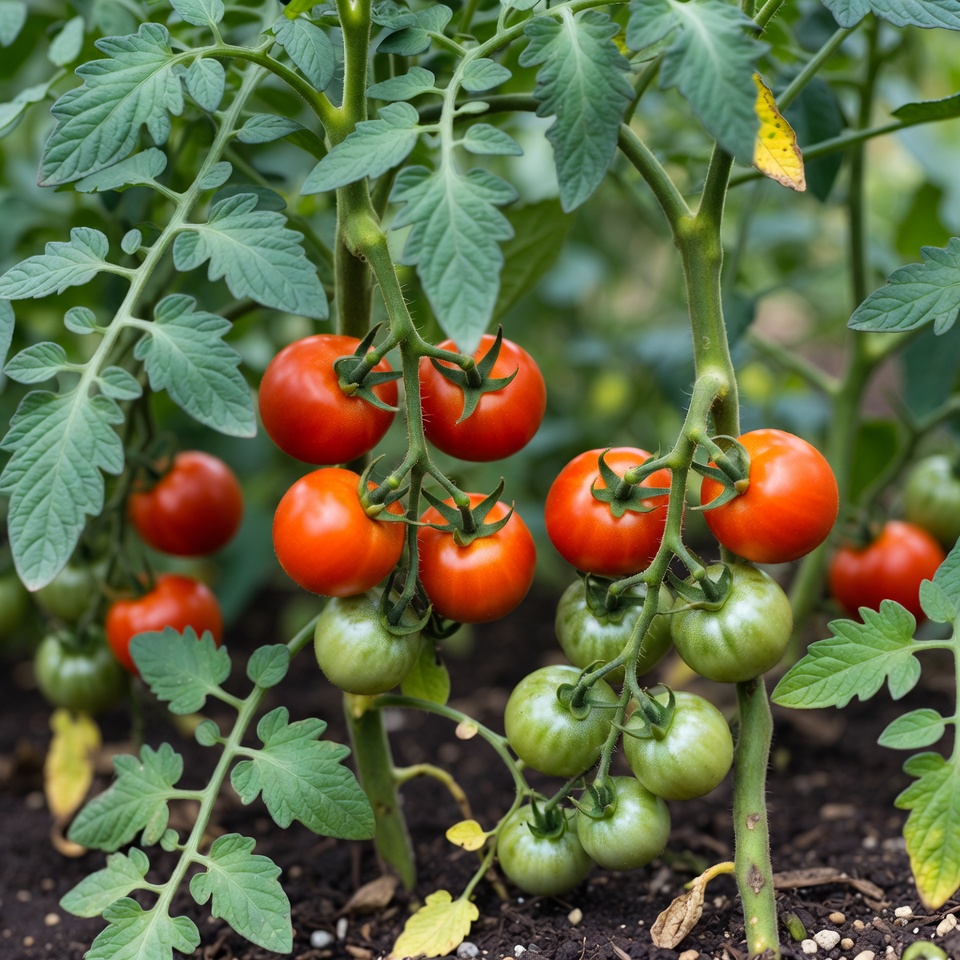 fresh tomatoes, fruit clusters, garden plant, green leaves, green tomatoes, outdoor garden, red tomatoes, ripe tomatoes, soil, tomato garden, tomato leaves, tomato plant, tomato stems, vegetable plant, tomatoes
