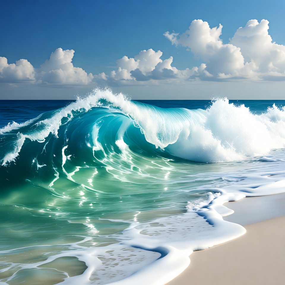A large turquoise ocean wave crashes powerfully onto a sandy beach under a clear blue sky with scattered white clouds. The wave features foaming white crests and green hues reflecting sunlight. The sandy shore meets the vibrant sea in a dynamic seascape.