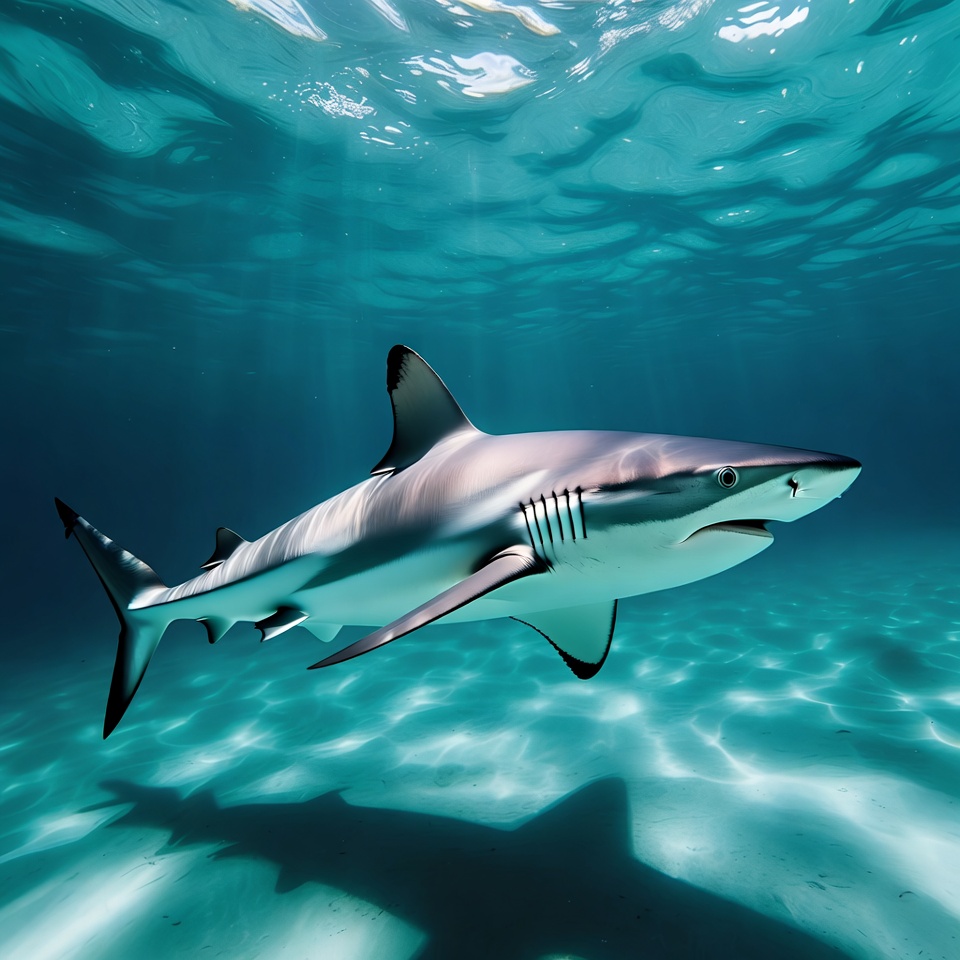 A blacktip shark glides through clear turquoise ocean water. Its sleek body features a white underbelly and distinctive black tips on its fins. Sunlight filters from above, casting shadows on the sandy seafloor.