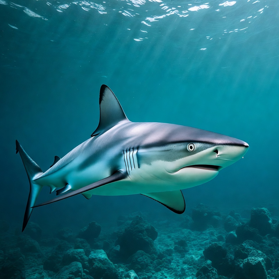 animal, aquatic, blacktip shark, blue water, coral rocks, fins, fish, isolated background, marine life, ocean, predator, sea, sunlight, swimming, turquoise water, underwater, wildlife, shark