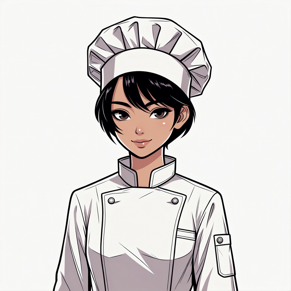 Asian, anime, cartoon, chef uniform, female, illustration, isolated background, kitchen chef, manga style, professional chef, short black hair, smiling, white chef hat, woman, chef