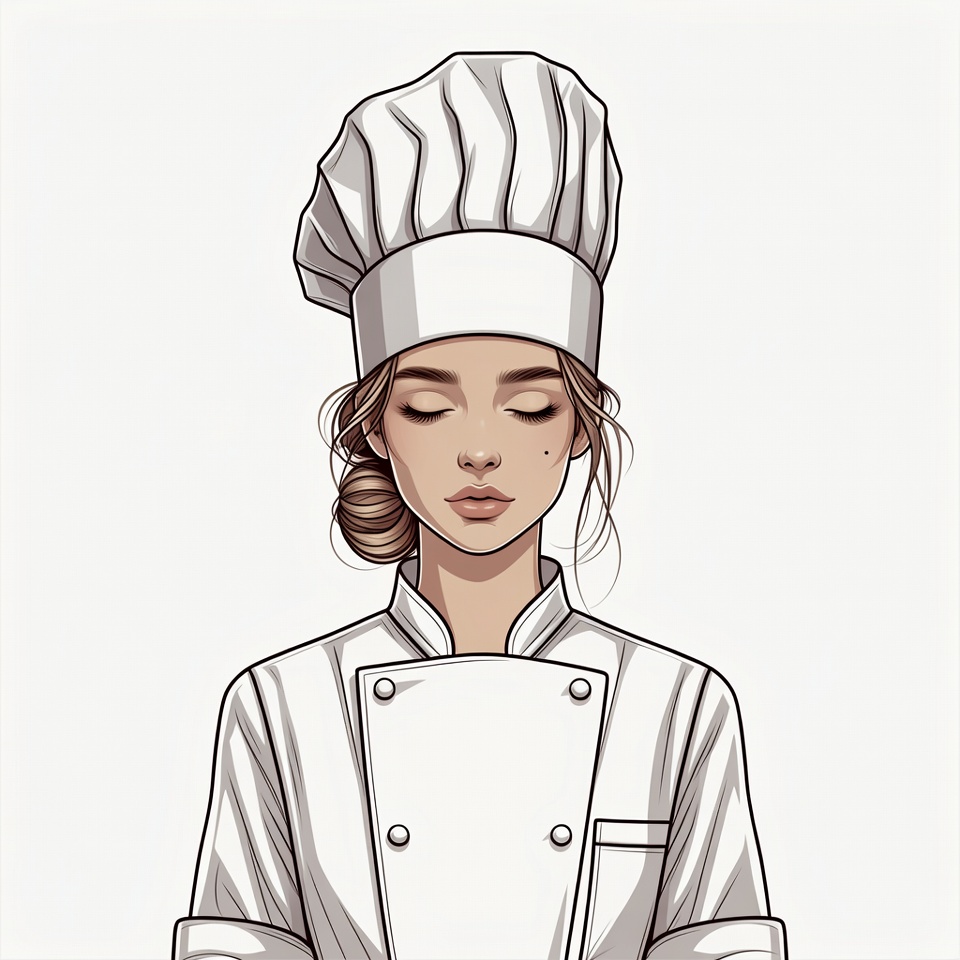 A detailed vector illustration of a young woman as a chef stands with eyes closed on a white background. She wears a tall white chef's toque and a double-breasted white chef's uniform with her brown hair in a loose bun. Her serene expression and stylish line art emphasize her professional attire.