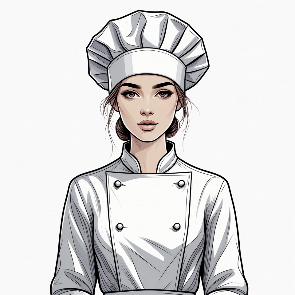 An illustration of a young woman dressed as a chef stands against a white background. She wears a tall white chef's hat, a white chef's jacket with black buttons, and has her brown hair styled in a loose bun. Her face features almond-shaped eyes and full lips in a detailed vector art style.
