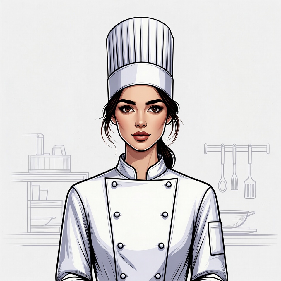 An illustration of a beautiful woman with dark hair in a ponytail wearing a tall white chef's hat and double-breasted chef's jacket. She stands confidently against a kitchen background with shelves, utensils hanging on a rack, pots, and dishes. The image features a clean white isolated background with subtle line art details.