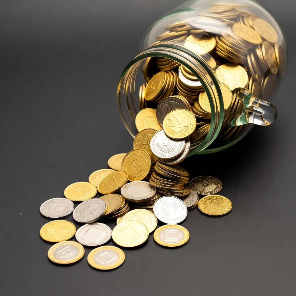 A clear glass jar tilts on a dark background, pouring out a cascade of shiny gold and silver coins. The coins spill onto the surface below, creating a pile of mixed currency. The jar's transparency highlights the gleaming metallic contents.
