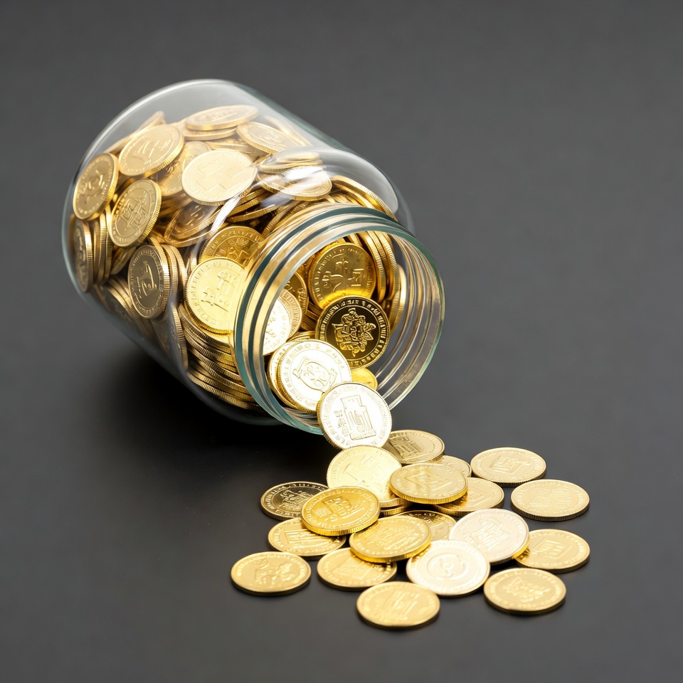 A clear glass jar tipped over on a dark background spills shiny gold coins onto the surface. Numerous coins cascade out, some still inside the jar and others scattered below. The coins feature detailed designs and gleam under the light.