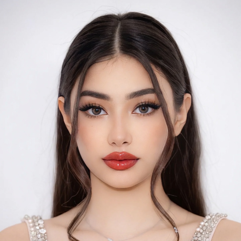 A young woman with long dark hair and striking makeup poses against a white background. She has almond-shaped eyes enhanced with eyeliner and glossy red lips. She wears a pearl necklace visible at her neckline.