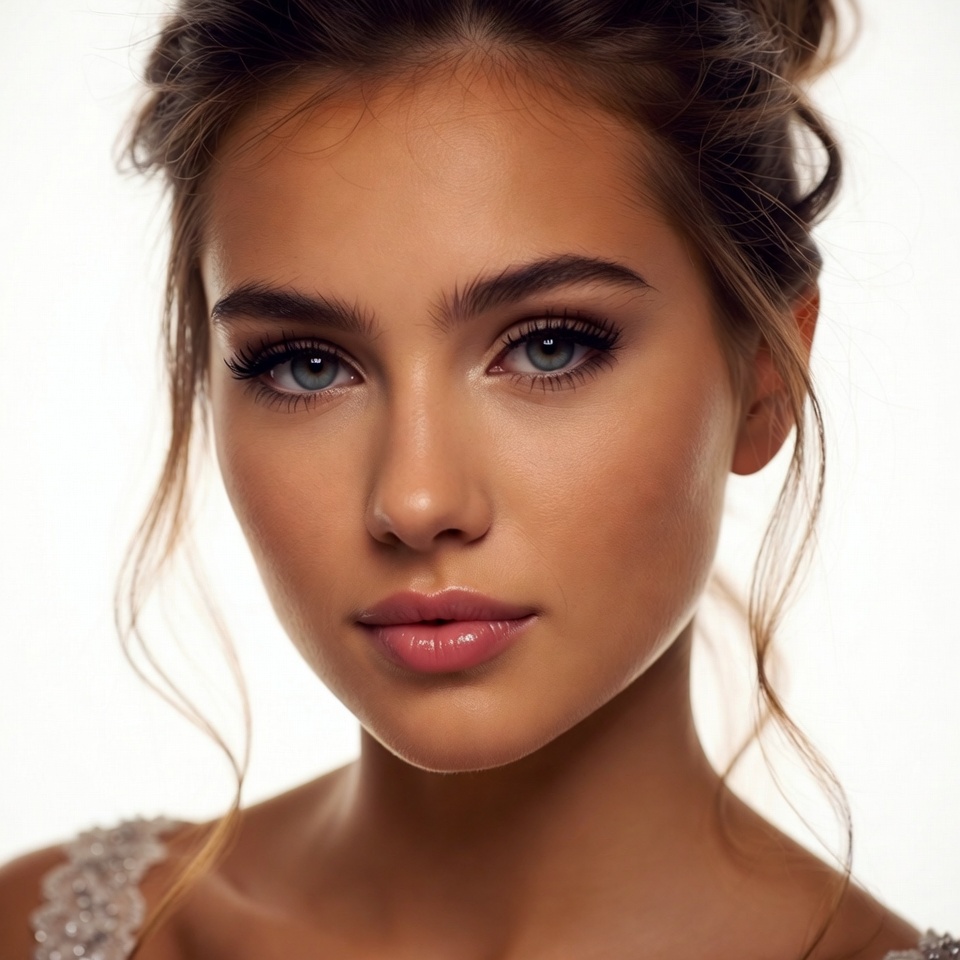 Multiracial, beautiful, beauty, blue eyes, bun hair, closeup, dark hair, fashion, female, full lips, glossy lips, headshot, lace straps, long lashes, makeup, portrait, smoky eyes, tanned skin, updo hairstyle, white background, young woman, woman