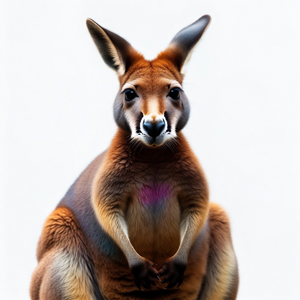 animal, australian animal, brown fur, colorful chest, isolated background, large ears, marsupial, pink chest, portrait, purple glow, red kangaroo, standing kangaroo, white background, wildlife, kangaroo