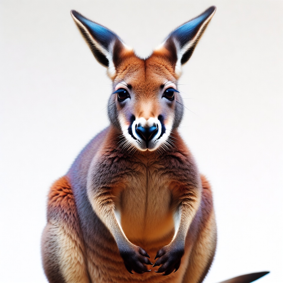 A red kangaroo stands on a white background with striking blue tips on its large ears. The kangaroo faces forward with expressive eyes and a white muzzle. Its reddish-brown fur covers a muscular body and strong legs.