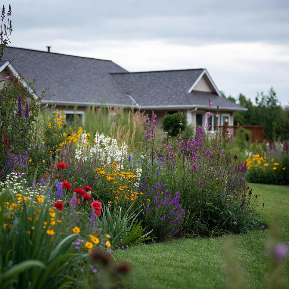 A charming house with dark gray shingled roof and white trim sits amidst a vibrant garden overflowing with flowers. Tall purple, pink, yellow, white, and red blooms in various shapes border a lush green lawn under a cloudy sky. Ornamental grasses and shrubs enhance the natural landscaping around the home.