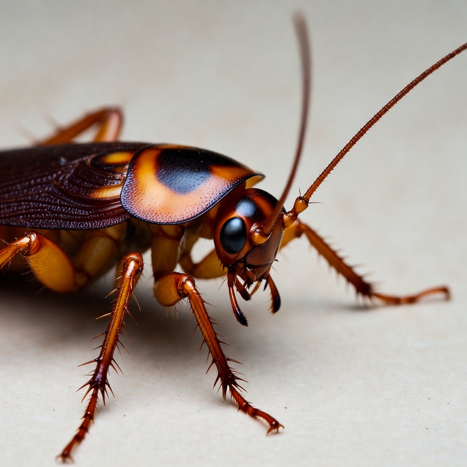 A detailed close-up view of an American cockroach with shiny reddish-brown exoskeleton and distinctive yellow markings on its head and thorax. Its long antennae and spiny legs are prominently visible against a plain light background. The insect faces forward with large black compound eyes.