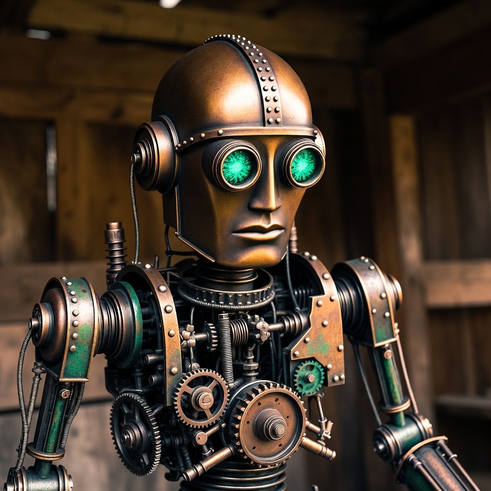 Steampunk Robot with Glowing Green Eyes